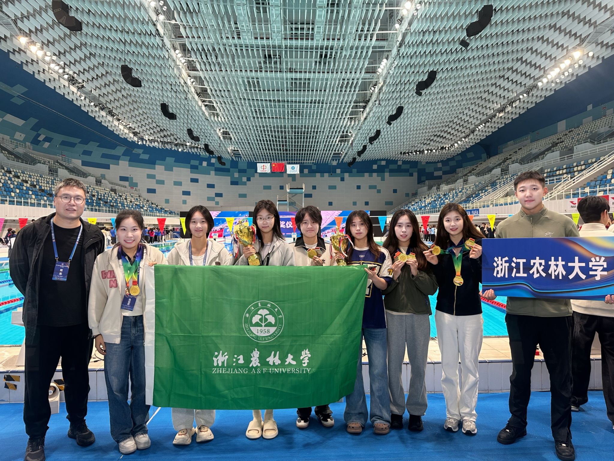 在本次比赛中,胡欣雨(林生院)、李静毓(经管学院)、赵若涵(经管学院)、林千淇(化材学院)在女子甲组4X50米自由泳接力中打破该项目的全国大学生甲组最高纪录并强势摘得金牌;李静毓(经管学院)、单单(文法学院)、胡欣雨(林生院)、林千淇(化材学院)获得了女子4X100米混合泳接力金牌。来自经管学院的李静毓获得女子甲组200米仰泳金牌、100米仰泳第六名;来自林生院的胡欣雨获得了女子甲组50米蝶泳银牌、100米蝶泳铜牌;来自化材学院的林千淇获得女子甲组400米自由泳铜牌、200米自由泳第五名。来自文法学院的单单获得女子甲组200米蝶泳铜牌、100米蝶泳第五名。