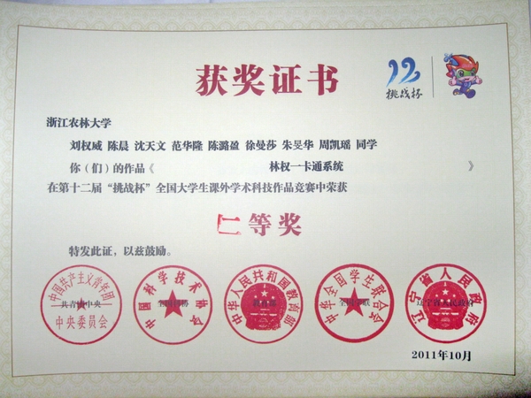 AC米兰中文官方网站新闻网讯 10月19日晚,由共青团中央、中国科协、教育部、全国学联和辽宁省政府共同主办的第十二届“挑战杯”竞赛终审决赛在大连理工大学隆重闭幕。由米兰徐爱俊老师指导,刘权威、陈晨、沈天文、范华隆、陈潞盈、徐曼莎、朱旻华、周凯瑶等同学共同完成的作品《林权一卡通系统》,荣获全国二等奖。