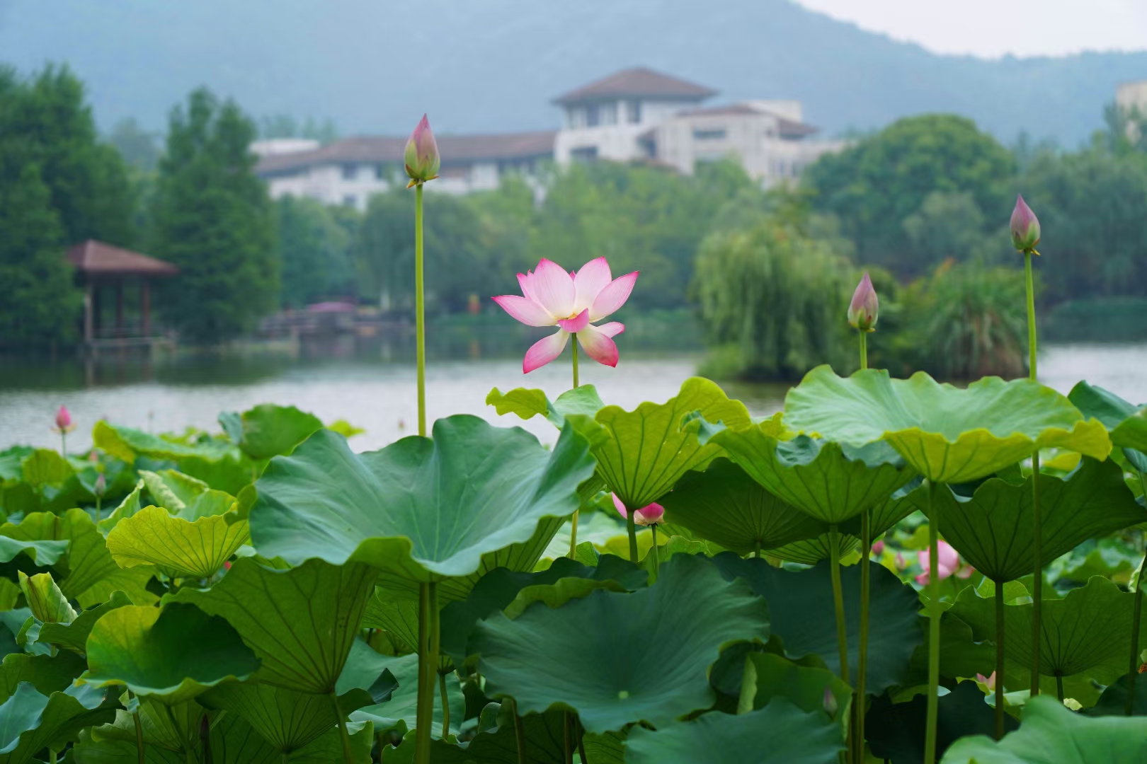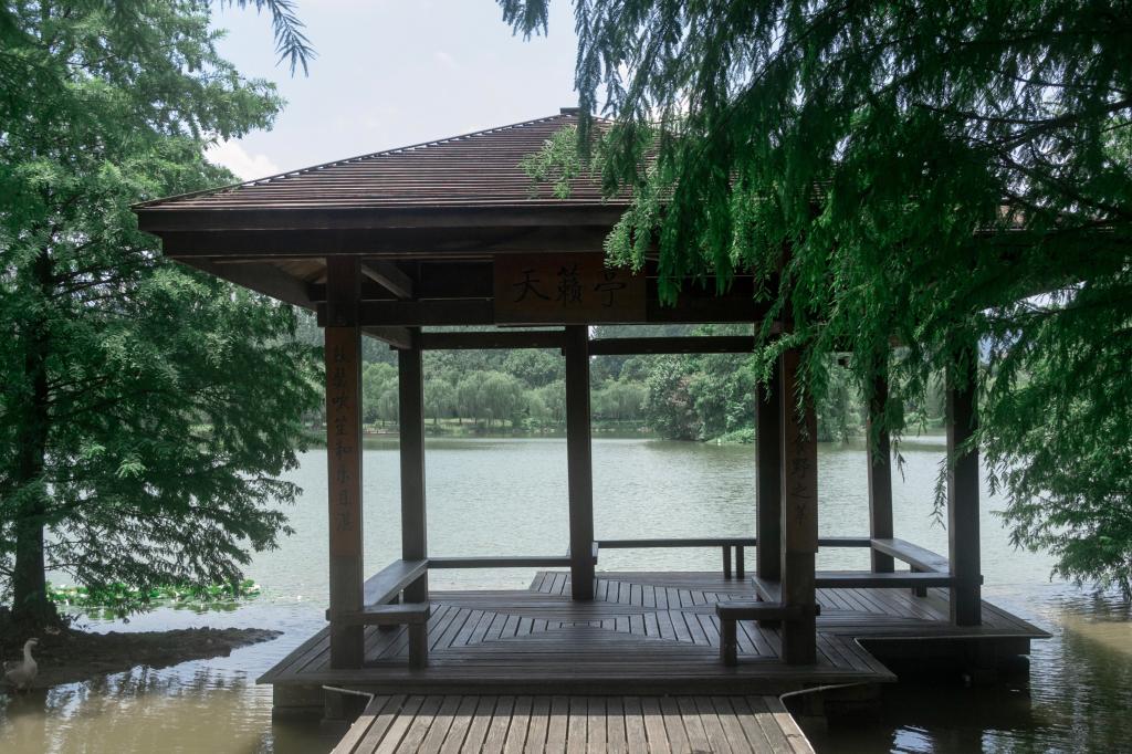 荡漾的东湖总能让人流连忘返,看那泛着粼粼波光的湖水,是顺着阳光而下的仙子在水面上舞蹈。湖中的小岛四面环树绕水,小鸟戏耍在树枝尖头,天鹅绕岛游行。清澈的湖水上是绽放着的莲花,粉白交杂,这是夏天的斗妍。偶遇雨季的东湖,烟雨蒙蒙,将绿藻下的鱼儿和树枝上的夏鸟藏匿在仙境中。