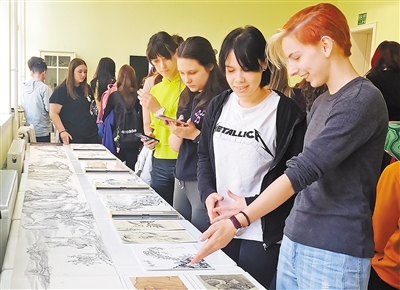 在诺维萨德大学孔子学院,学员正在欣赏中国传统绘画作品。 诺维萨德大学孔子学院供图