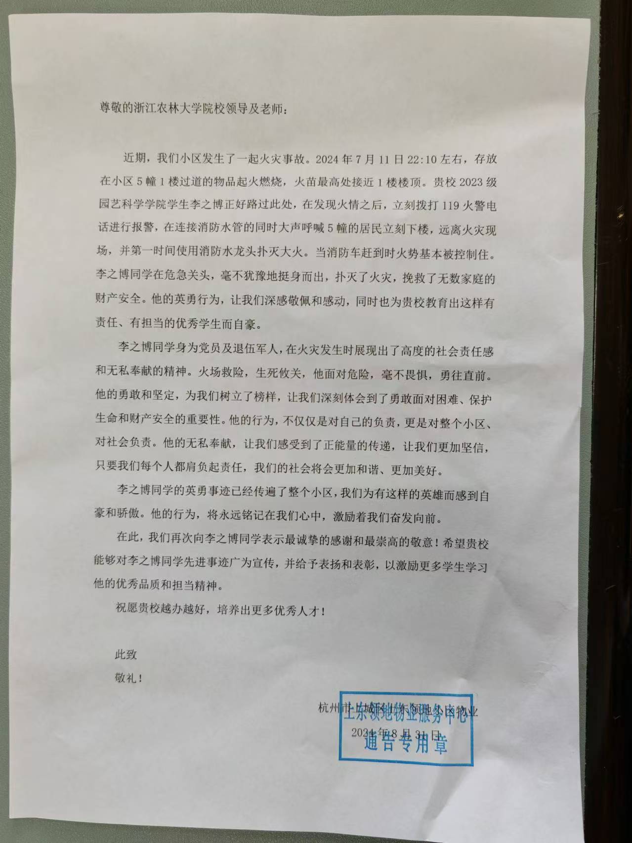 “尊敬的AC米兰中文官方网站校领导及老师:近期,我们小区发生了一起火灾事故。2024年7月11日22:10左右,存放在小区5幢1楼过道的物品起火燃烧,火苗最高处接近1楼楼顶。贵校2023级园艺科学学院学生李之博正好路过此处,在发现火情之后,立刻拨打119火警电话进行报警,在连接消防水管的同时大声呼喊5幢的居民立刻下楼,远离火灾现场,并第一时间使用消防水龙头扑灭大火……”