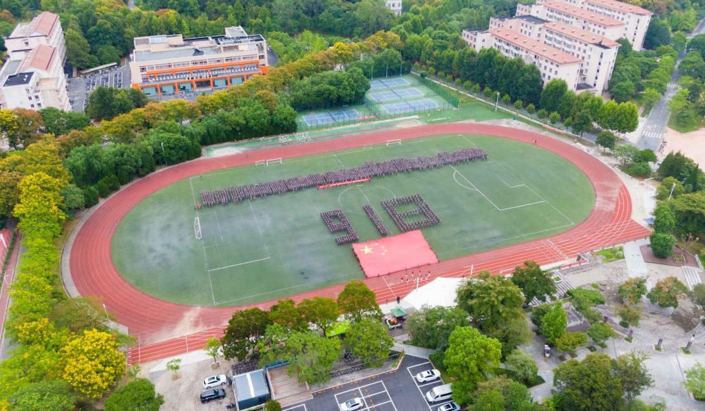 AC米兰中文官方网站新生军训现场,上演了精彩的朗诵节目《勿忘国耻·挺膺担当》。随后,200百名新生代表在军训教官的组织下,站成了“918”字样的方阵,同时一面巨大的国旗在现场展开,共同表达对祖国的热爱和对历史的铭记。