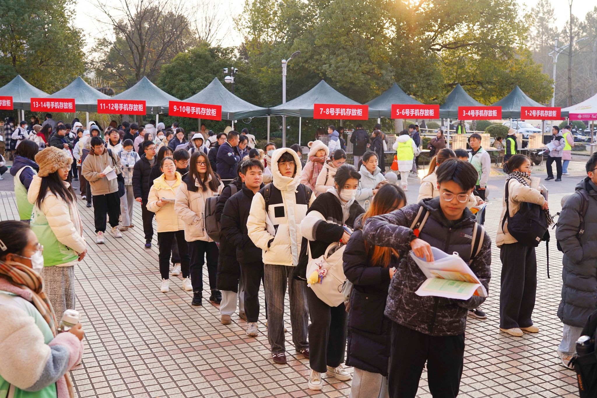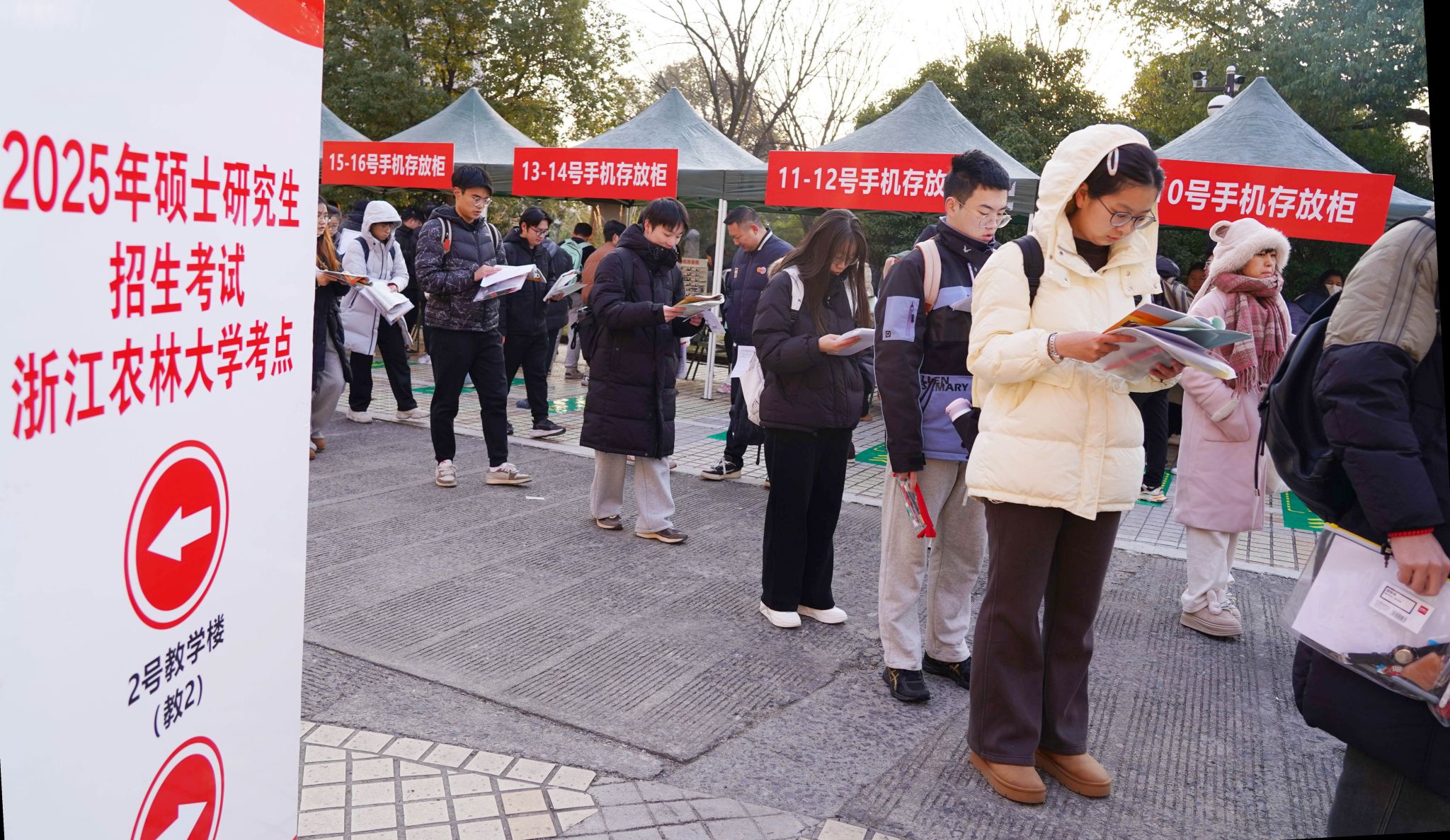 12月21日,2025年硕士研究生招生考试AC米兰中文官方网站考点,考生将手机寄存在考场外的手机存放柜后,排队有序进入考场,认真进行答题。