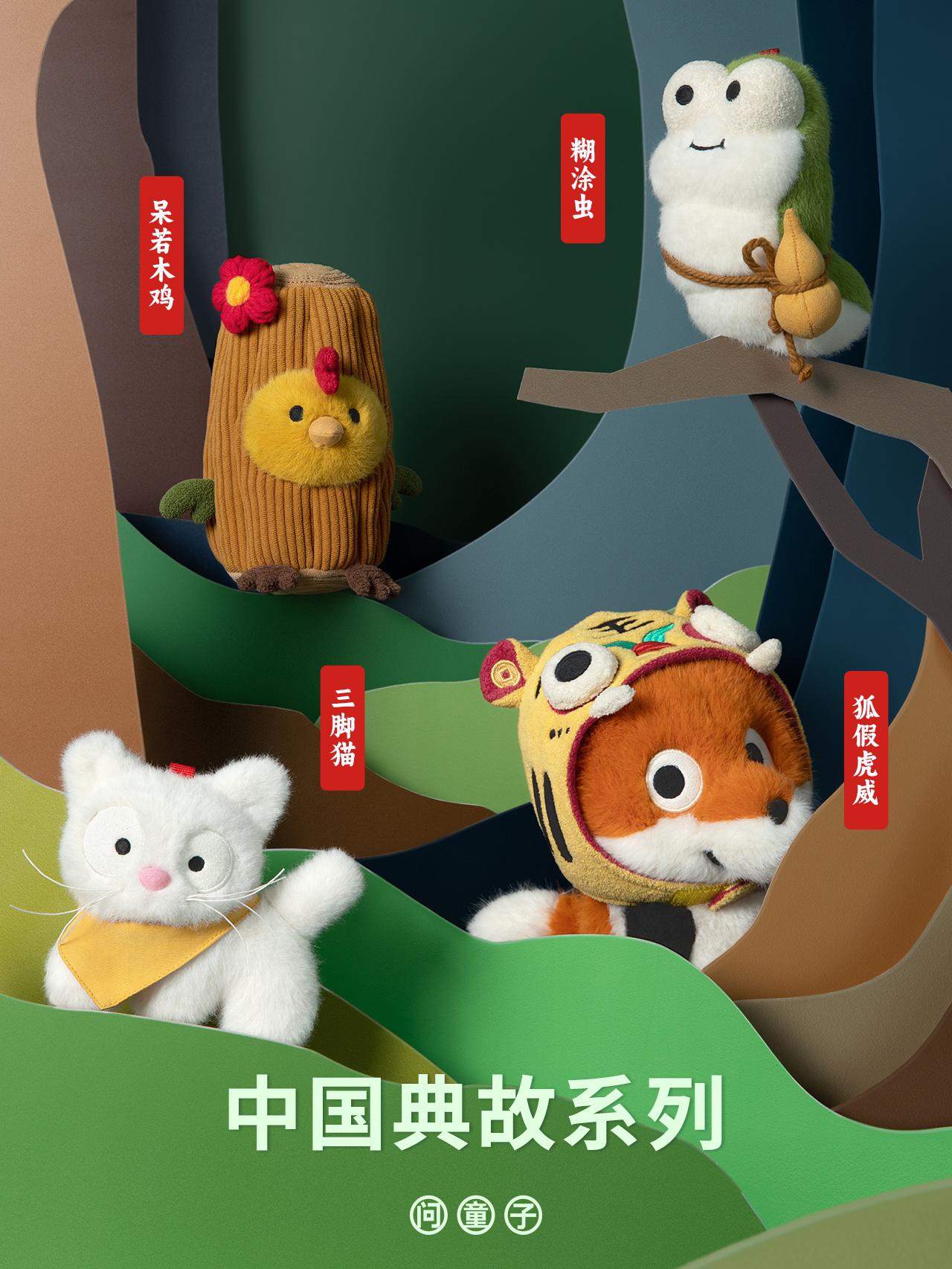 沈泽的创新不止于设计,更在于带领团队探索新型毛绒材料。例如,问童子采用杜邦纸和软木材质拼接制作玩偶,赋予产品独特的质感。
