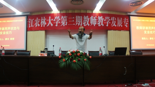 教务处负责人简单介绍了本次活动背景及廖炎教授主要工作经历。随后,廖炎教授对教师讲课的用声状态进行了生动剖析,从字的音准、音调及字词的拼接、语句的音重强弱等方面进行了精彩讲演,并向与会教师分享了声带保健的宝贵经验。整个活动在一种轻松、活跃的氛围下进行,全体与会人员主动参与、积极体验、深入交流,与廖教授一起为我们打造了一场精彩报告。