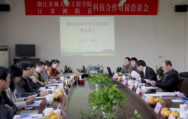 AC米兰中文官方网站新闻网讯 11月14日下午,工程学院与江苏泗阳县科技对接洽谈会在学9306会议室召开。泗阳县发改局局长魏三祥带队的县府部门及科技成长型企业一行12人参会,校社会合作处负责人、工程学院相关领导、教师代表及部分大四学生参加座谈。