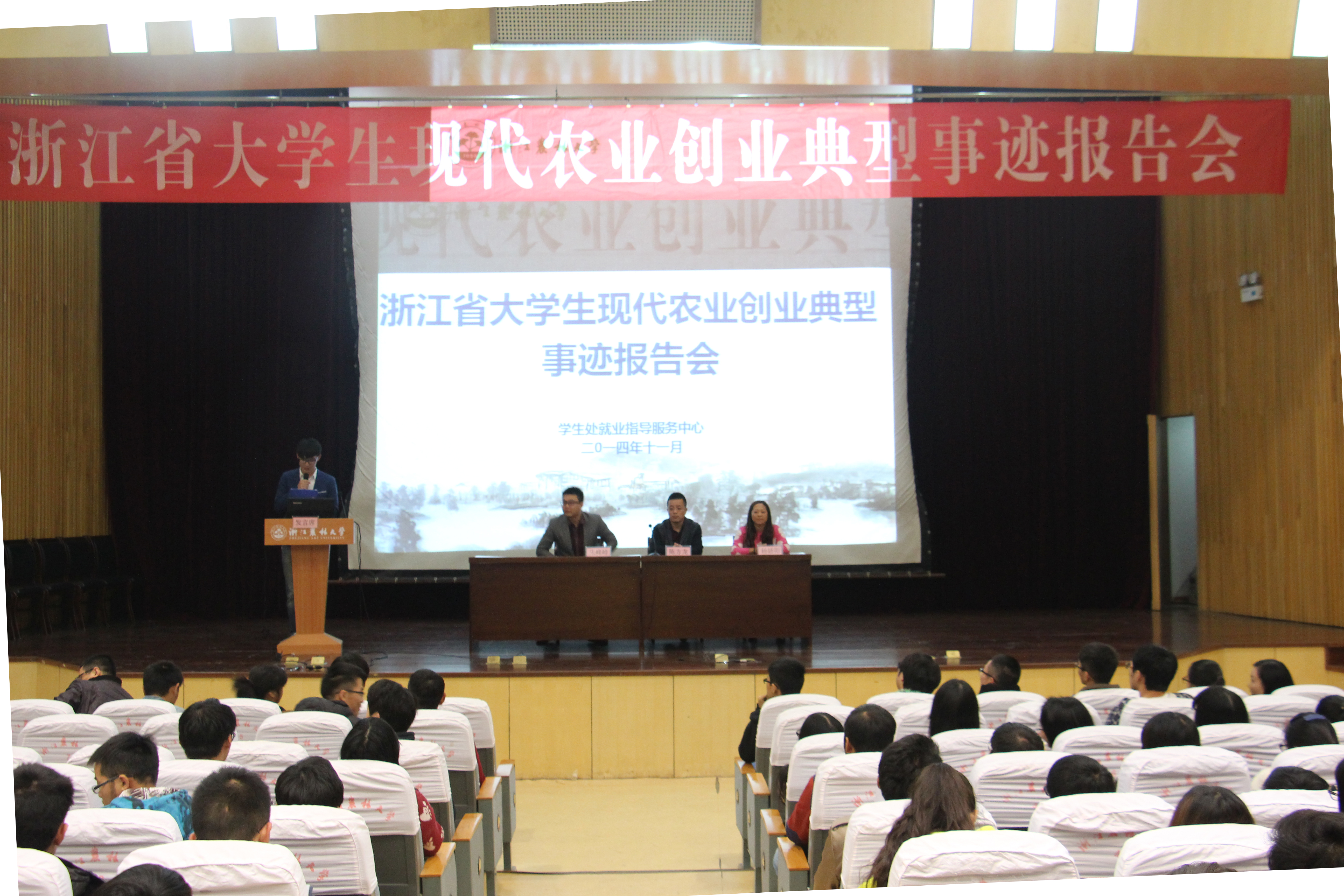 报告会上,杭州市大动脉生物科技有限公司总经理陈方龙、杭州市百乡缘农业开发有限公司总经理朱峰峰、天台市田禾粮食专业合作社创始人杨骄阳三位创业典型先后发言,分别讲述了自己的创业经历和成功经验,展示了当代大学生吃苦耐劳、自强不息、敢于创新、积极进取、勇于开拓的创业风采。在随后的现场交流环节,现场气氛活跃,同学们积极互动,三位优秀大学生创业者也逐一认真解答了学生们在创业方面的疑问。