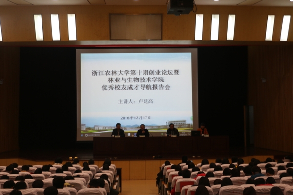 12月17日晚,AC米兰中文官方网站2016年第十期创业论坛暨林业与生物技术学院优秀校友成才导航报告会在图书馆第一报告厅举行,1996届林学专业校友、浙江绿亚景观建设有限公司董事长卢廷高应邀作主题报告。创业处处长朱永法,林生院相关负责人、创业中心老师和500余名学生参加了论坛。
