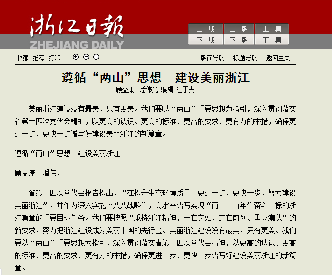 6月27日,《浙江日报》以大篇幅刊登米兰中国农民发展研究中心理论文章《遵循“两山”思想 建设美丽浙江》。