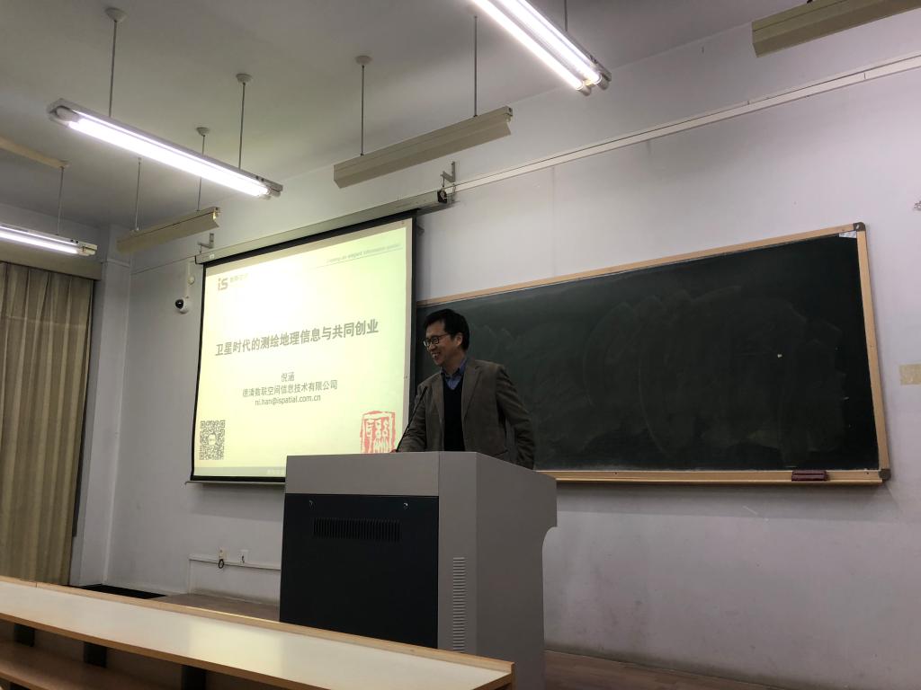 倪涵以一个短片“不同角度看世界”开局,向同学们展示了遥感卫星时代的到来,详细介绍了全球的卫星发展现状以及我国的卫星发展情况,对卫星遥感的将来进行了充分的展望,极大地拓宽了同学的视野,调动了同学们对未来空间信息技术的兴趣和信心。倪涵还结合自身的成长经历,从一名大学教师转型发展到一位拥有13家子公司的企业老总,告诫同学们创业不仅仅是为了赚钱,而是一种充分挖掘生命意义的生存方式;阐明了自主创业的基本特质需要具备愿力、眼力、毅力、魅力和体力;分析了企业经营的本质是通过融资与投资产生利润和价值;建议同学们的一个创业模式就是与成熟企业合作,共同创业。