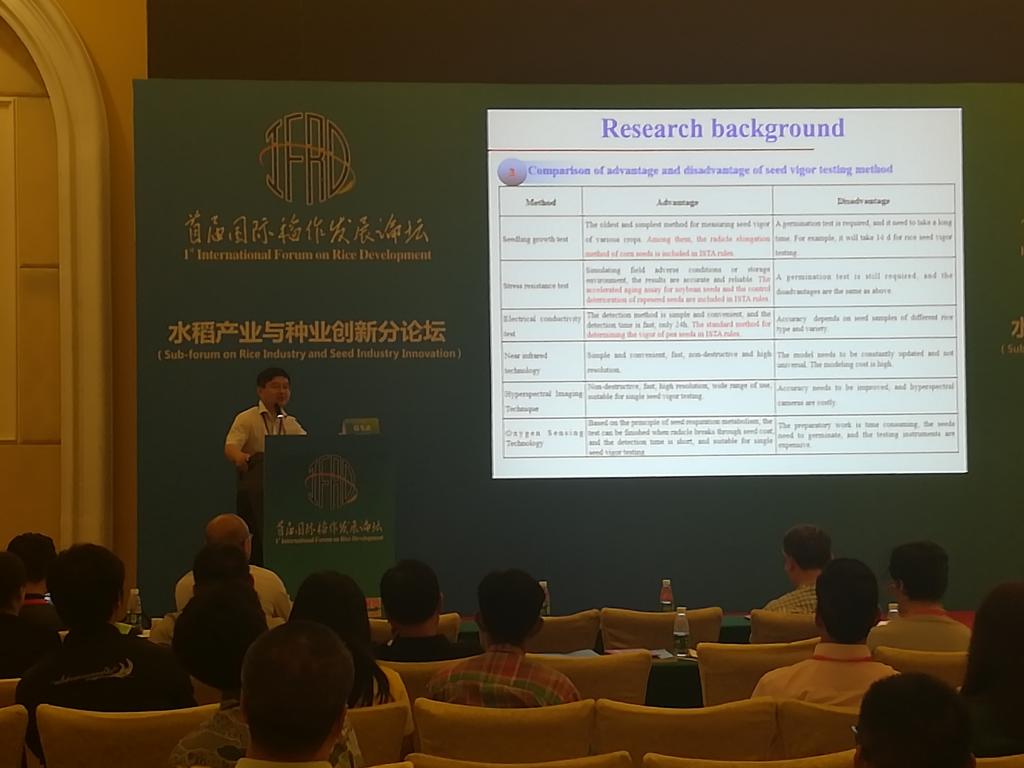 大会共设置了四个分主题:水稻资源与种质创新、稻作栽培与绿色生产、水稻产业与种业创新、稻作文化传承与创新发展。在“水稻产业与种业创新”分论坛上,米兰赵光武教授应邀作了“氧传感技术和高光谱技术在水稻种子活力检测中的应用”的学术报告,系统介绍了氧传感技术和高光谱技术的原理及其在水稻种子活力检测方面的研究进展,并围绕水稻种子质量的快速无损检测与分选技术进行了总结和展望,获得了与会专家及同行的高度关注。