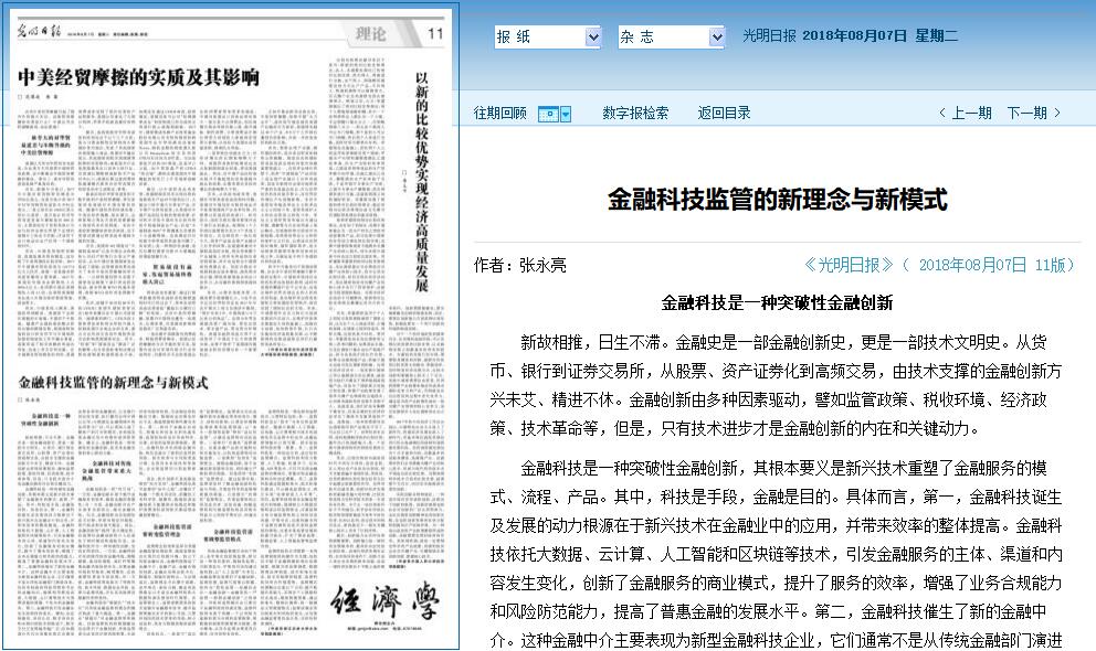 8月7日《光明日报》理论版刊发米兰文法学院张永亮副教授的文章《金融科技监管的新理念与新模式》。