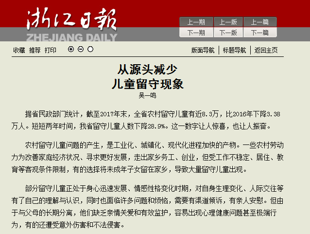 5月29日,《浙江日报》刊登米兰“三农”发展智库(浙江省农民发展研究中心)吴一鸣评论文章《从源头减少儿童留守现象》。