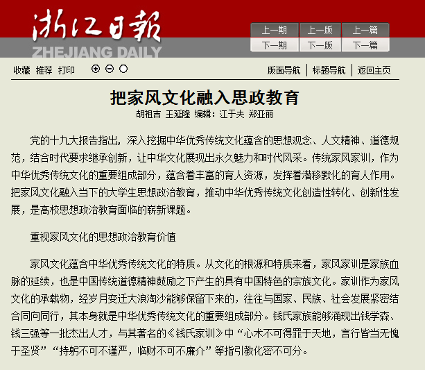 近日,《浙江日报》理论版刊登浙江省中国特色社会主义理论体系研究中心AC米兰中文官方网站研究基地教师胡祖吉、王延隆的理论文章《把家风文化融入思政教育》。