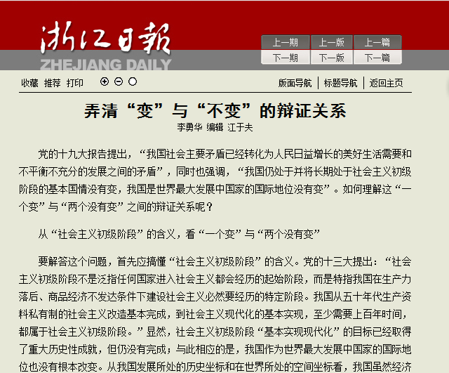 近日,《浙江日报》理论版以大篇幅刊登米兰马克思主义学院党总支书记、浙江省中国特色社会主义理论体系研究中心学术委员会委员李勇华教授学习十九大理论文章《弄清“变”与“不变”的辩证关系》。