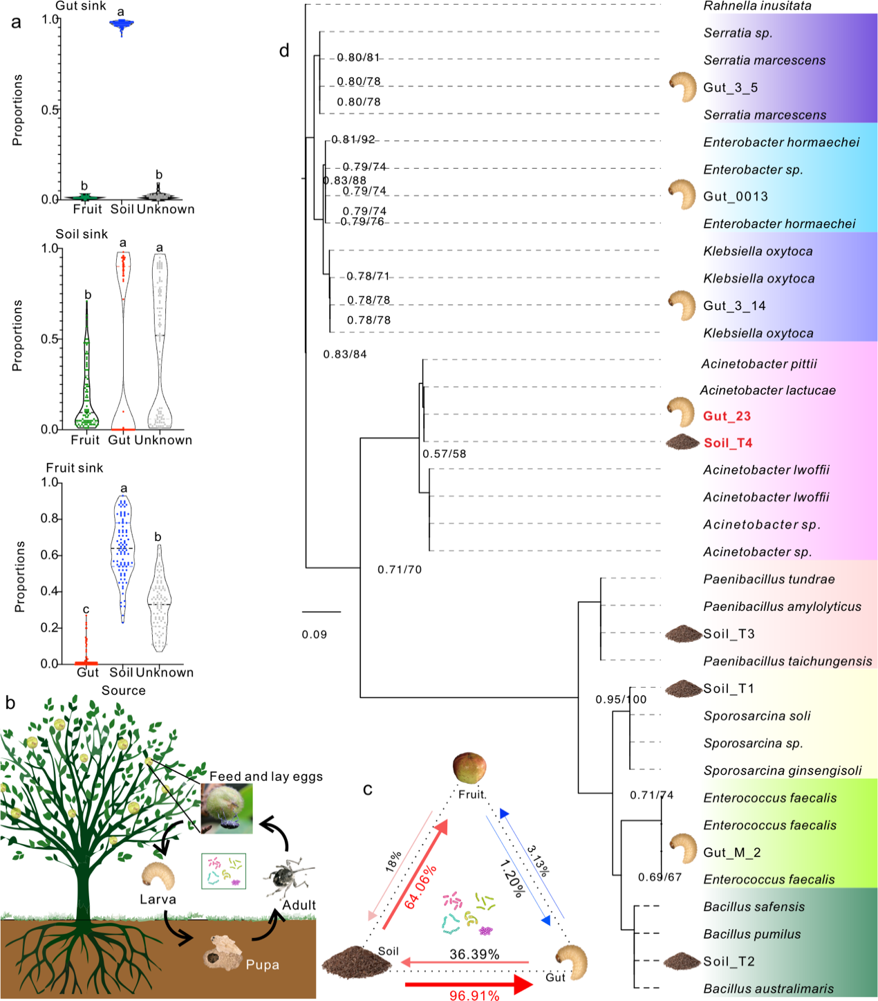 图1.茶籽象肠道、蛹室土壤、及油茶果实微生物组多样性分析