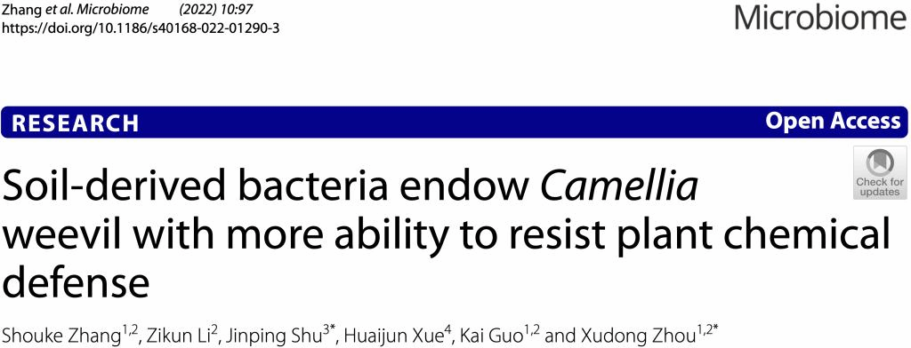 近日,国家重点实验室森林健康“森林-昆虫-微生物互作”研究团队(周旭东教授课题组)在微生物学领域顶级期刊《Microbiome》(中科院1区TOP期刊,IF=16.837)上发表研究论文《Soil-derived bacteria endowCamelliaweevil with more ability to resist plant chemical defense》,揭示了来源于土壤的肠道细菌赋予茶籽象更强的植物化学抗性抵抗能力。