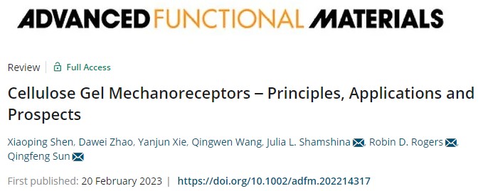 2023年2月20日,林业工程学科生物质仿生智能研究团队青年教师教师沈晓萍以第一作者在材料科学领域国际期刊《Advanced Functional Materials》(中科院1区Top,IF=19.924)在线发表题为“Cellulose gel mechanoreceptors - principles, applications and prospects”(木质纤维素凝胶基智能机械感受材料-原理、应用及展望)的综述论文。通讯作者为美国得克萨斯理工大学Julia L. Shamshina助理教授、美国阿拉巴马大学Robin D. Rogers教授和AC米兰中文官方网站孙庆丰教授。AC米兰中文官方网站化学与材料工程学院为该论文第一单位和通讯作者单位。