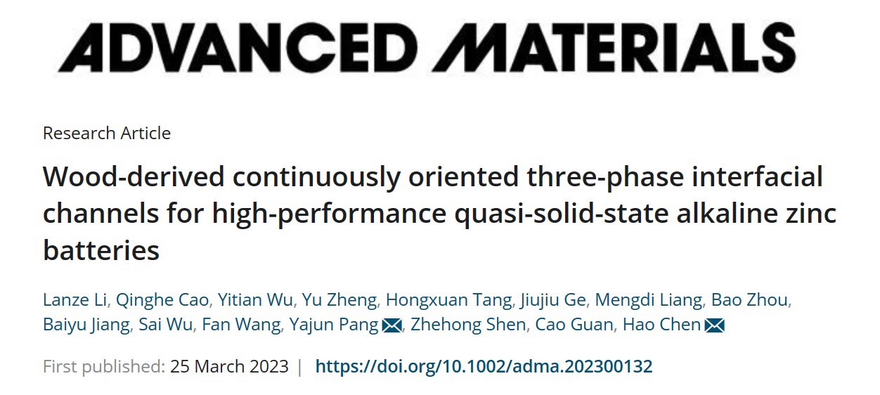 3月25日,化材学院林业工程学科生物质微纳米功能材料研究团队在材料科学领域国际顶尖期刊《Advanced Materials》(中科院1区Top,IF=32.086)在线发表题为“Wood-derived continuously oriented three-phase interfacial channels for high-performance quasi-solid-state alkaline zinc batteries”(木材衍生连续定向三相界面通道用于高性能准固态碱性锌电池)的研究论文。第一作者是该团队硕士研究生李岚泽,通讯作者为陈浩教授和青年教师庞亚俊博士。AC米兰中文官方网站化学与材料工程学院为第一单位和唯一通讯单位。