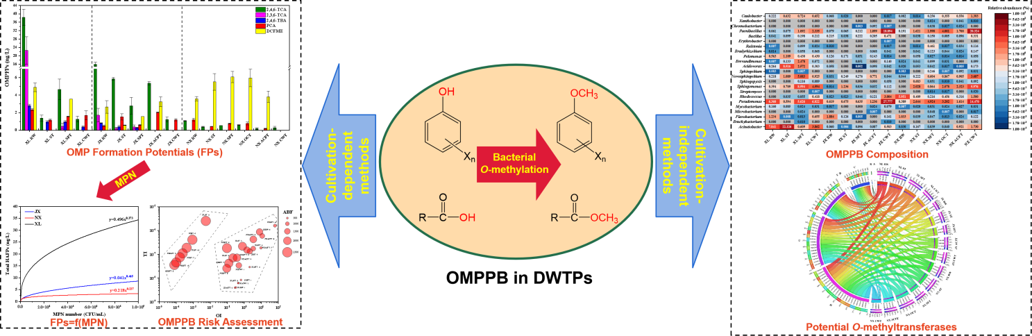 O-甲基化污染物(OMP)由含羟基前体物(如卤代酚、双氯芬酸等)经微生物O-甲基化作用生成,具有强烈的土霉味和潜在致病性,已成为当前饮用水中一种不可忽视的新污染物。然而,作为OMP的主要贡献者——OMP生成细菌(OMPPB)在供水系统,特别是在饮用水厂中的分布情况和甲基化特性尚不清楚。本研究综合利用培养技术和非培养技术,围绕生物量测定、群落结构表征和污染风险评估等多个方面对不同饮用水厂中的OMPPB进行了系统的调查研究,主要研究结果为:OMP生成势(OMPFP)在不同水厂及处理工艺间存在显著差异;水处理工艺可有效降低OMPPB的数量,却增加了其在细菌总数中的比例;不同可培养OMPPB对3种典型前体物存在选择性,这造成了它们的产物在致嗅性、毒性和生物富集性上存在显著差异;水厂工艺可驱动饮用水中OMPPB群落结构和相关O-甲基转移酶发生改变;Mantel分析显示OMPPB群落组成与OMPFP组成之间存在关联,其中Mycobacterium属和Pelomonas属可能起到了关键作用。最后,文章还针对饮用水厂中OMPPB风险评估和控制方法的建立提出了若干建议。本研究可为饮用水中微生物源新污染物的生成与控制研究提供证据支撑。