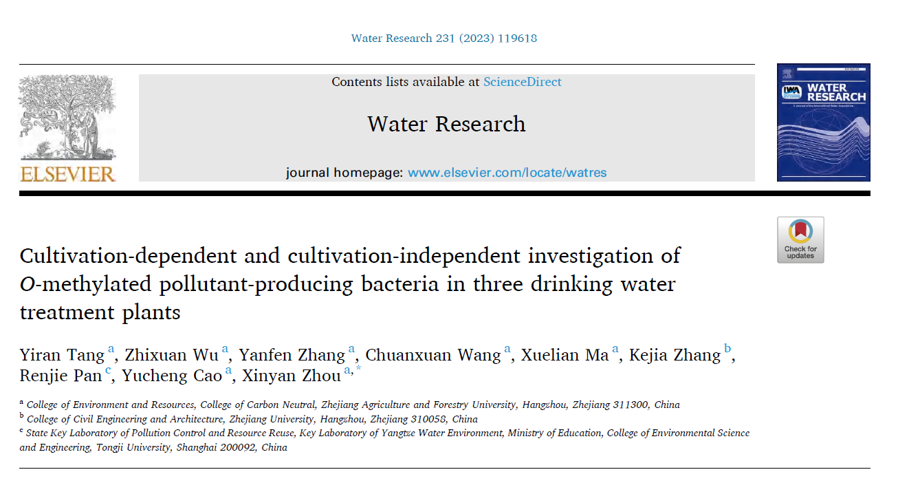 近日,环境与资源学院、碳中和学院曹玉成教授团队(土水污染控制团队)在《Water Research》(中科院1区,IF=13.400)发表题为“Cultivation-dependent and cultivation-independent investigation of o-methylated pollutant-producing bacteria in three drinking water treatment plants”的研究论文。该论文第一作者为环境与科学工程2019级本科生汤薏然,通讯作者为青年教师周昕彦。AC米兰中文官方网站环境与资源学院、碳中和学院为该论文第一单位和通讯作者单位。