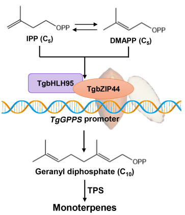 该研究利用共表达网络分析并结合转录组分析鉴定到候选基因TgGPPS,该基因表达与香榧后熟过程萜类物质含量呈显著正相关。烟草叶片瞬时过表达和番茄果实过表达显示,TgGPPS促进萜类物质的积累。转录组分析筛选到与TgGPPS协同表达的转录因子TgbHLH95和TgbZIP44。利用双荧光素酶、酵母单杂交、EMSA试验表明TgbHLH95间接激活TgGPPS启动子,TgbZIP44直接结合TgGPPS启动子。此外,BiFC、LCI、Co-IP和GST pull-down分析显示,TgbHLH95与TgbZIP44存在蛋白互作。研究结果丰富了香榧坚果萜类合成的分子机制,也为其他坚果呈香物质的形成与调控提供借鉴作用。