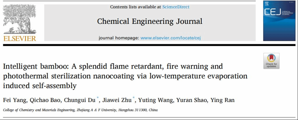近日,化材学院生物质材料功能性改良与复合技术研究团队在国际知名期刊《Chemical Engineering Journal》(中科院1区Top,IF=15.1)在线发表题为“Intelligent bamboo: A splendid flame retardant, fire warning and photothermal sterilization nanocoating via low-temperature evaporation induced self-assembly”的研究论文。化材学院林业工程学科杜春贵教授、青年教师朱家伟为通讯作者,在读博士生杨菲为第一作者。
