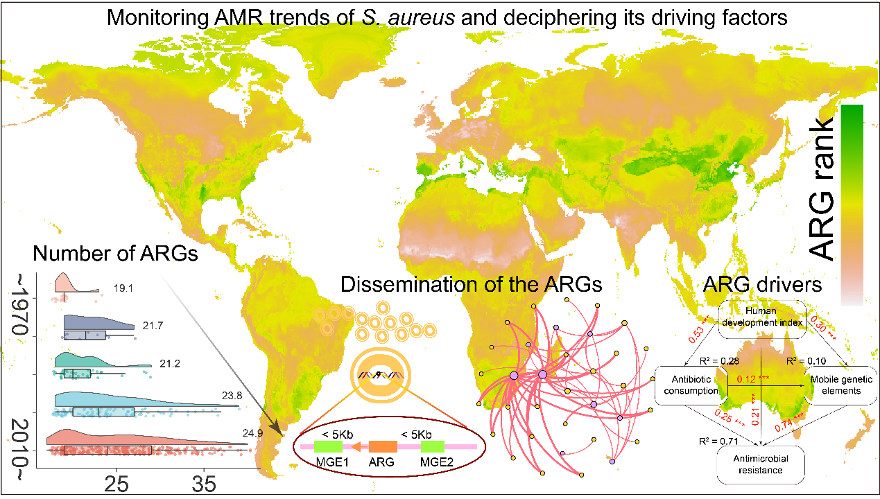 该论文探究了100多年来全球食源性致病菌—金黄色葡萄球菌(Staphylococcus aureus)耐药基因的进化的驱动因素及传播机制。AC米兰中文官方网站食品与健康学院方冠宇老师为论文的第一作者和通讯作者,刘兴泉教授为文章的通讯作者。