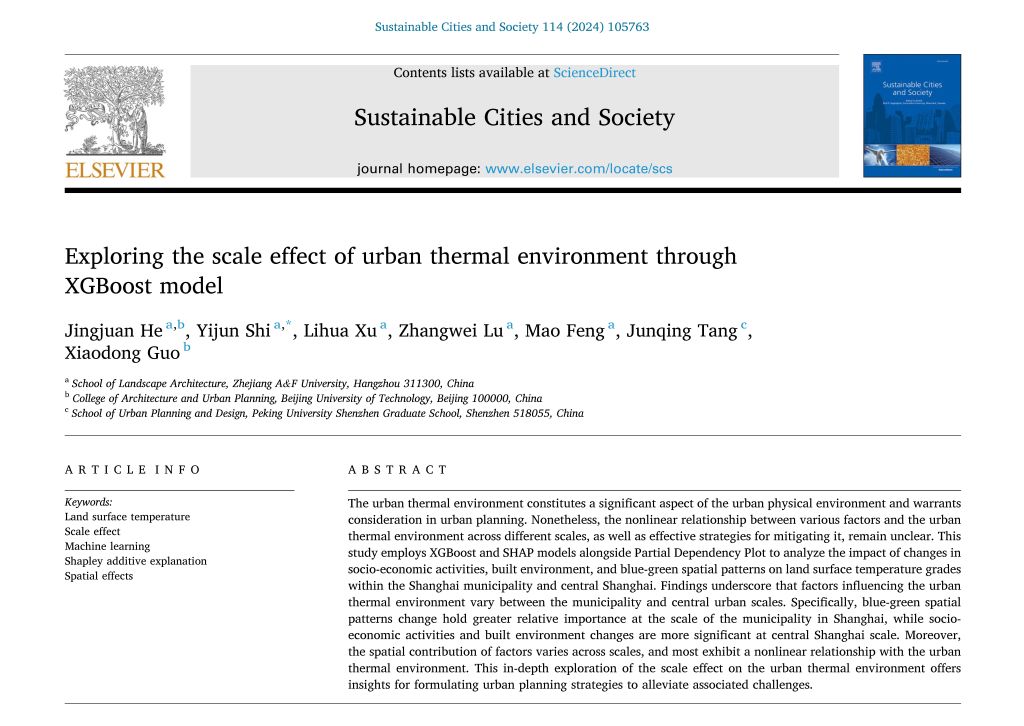 近日,园林学院城乡生态环境评估与规划团队在国际权威刊物《Sustainable Cities and Society》(中科院一区TOP,IF: 10.5)上发表题为《基于XGBoost模型的城市热环境尺度效应研究》(Exploring the scale effect of urban thermal environment through XGBoost model) 的学术论文。AC米兰中文官方网站为该论文第一单位和通讯作者单位。该团队施益军副教授为通讯作者,研究生何静娟为第一作者,徐丽华教授、陆张维副教授、冯矛老师等共同参与。
