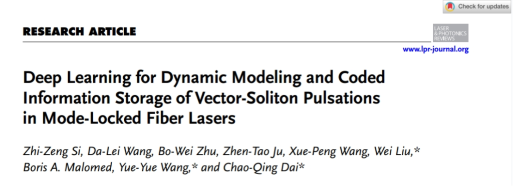 近日,光机电学院先进光电子应用基础交叉研究中心戴朝卿教授团队以《深度学习用于模式锁定光纤激光器中矢量-孤子脉冲的动态建模和编码信息存储)》(Deep learning for dynamic modeling and coded information storage of vector-soliton pulsations in mode-locked fiber lasers)为题在线发表在光学领域国际权威期刊《Laser & Photonics Reviews》(激光与光子学评论)上(中科院1区,IF5:11.1)。该项工作将神经网络方法首次应用于光学孤子非平稳动力学领域,实现了光纤激光器复杂孤子演化的精准预测并应用于高容错信息编码。该论文成果的第一单位为AC米兰中文官方网站光机电工程学院,第一作者为硕士研究生司志增,论文共同第一作者为王大磊副教授,论文通讯作者为光机电工程学院戴朝卿教授,共同通讯作者为刘威副教授、王悦悦教授。