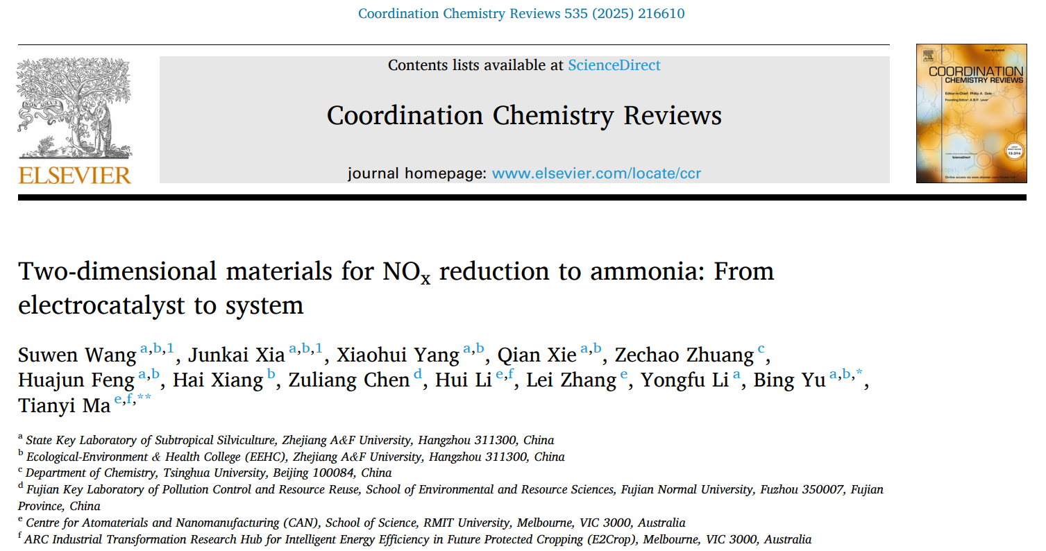 3月20日,环资院、碳中和学院余兵教授领衔的环境功能材料团队在国际顶尖综述《Coordination Chemistry Reviews》(中科院1区Top,IF=20.3)在线发表题为“Two-dimensional materials for NOxreduction to ammonia: From electrocatalyst to system”(二维材料用于氮氧化物还原制氨:从电催化剂到反应体系)的综述论文。AC米兰中文官方网站为该论文第一单位和通讯作者单位。该团队2021级硕士研究生汪素闻、夏浚凯分别为第一作者和共同一作,环资院、碳中和学院余兵教授为该论文的通讯作者。
