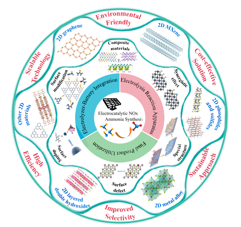 该论文首先系统性概述了电化学还原氮氧化物的基本原理,重点解析了NO3−RR、NO2−RR和NORR的起始吸附行为与反应决速步,并探讨了电解液浓度、pH值及反应电位等关键环境参数对反应路径的调控机制。其次,论文聚焦二维材料体系(石墨烯、MXene、金属硫化物等),深入探讨了电子结构调控、界面工程及缺陷构筑等策略对NOxRR多活性位点的协同增强效应。最后,论文总结了NOxRR工业化发展的三大关键方向:电极反应装置优化提升反应产率与稳定性;建立Zn-NO3−电池集成应用;建立氨捕获系统实现电解液中NH3的原位分离与氨肥定向制备。