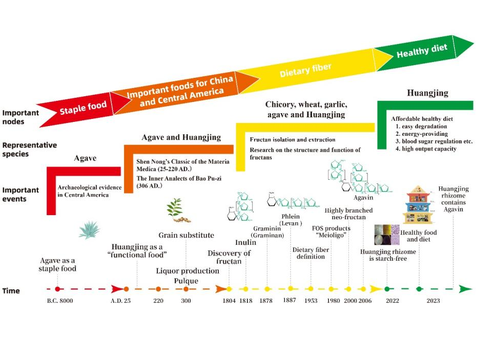 黄精是一种中国传统的食药同源物质,历史上一直被用作替代粮食植物。2021年,黄精石斛团队研究发现,黄精根茎不含淀粉,其核心营养功效物质果聚糖。果聚糖是三大植物储藏物质之一,在15%开花植物中存在,主要存在于禾本科植物(小麦、大麦、黑麦草、猫尾草和燕麦)、菊科植物(如菊苣和菊花)、石蒜科(大蒜、洋葱)和天门冬科(黄精、龙舌兰)中。天然果聚糖的代表性结构可根据蔗糖的位置和它们之间的果糖残基类型分为菊粉inulin、levan、graminan、neo-inulin、neo-levan、agavin 6种类类型,不同植物之间的结构和功能存在明显差异,黄精果聚糖是agavin型果聚糖(具有高度分支的(2/1)和(2/6)键,以及内部或末端葡萄糖单元),易降解,简单加工后可产生46.1%的单糖和二糖,与菊粉为代表的商业果聚糖(膳食纤维)存在本质的区别,纠正了传统上认为黄精主要依靠淀粉获取能量供应的错误观点,明确黄精果聚糖具有能量供应与慢性病预防的双重功能。
