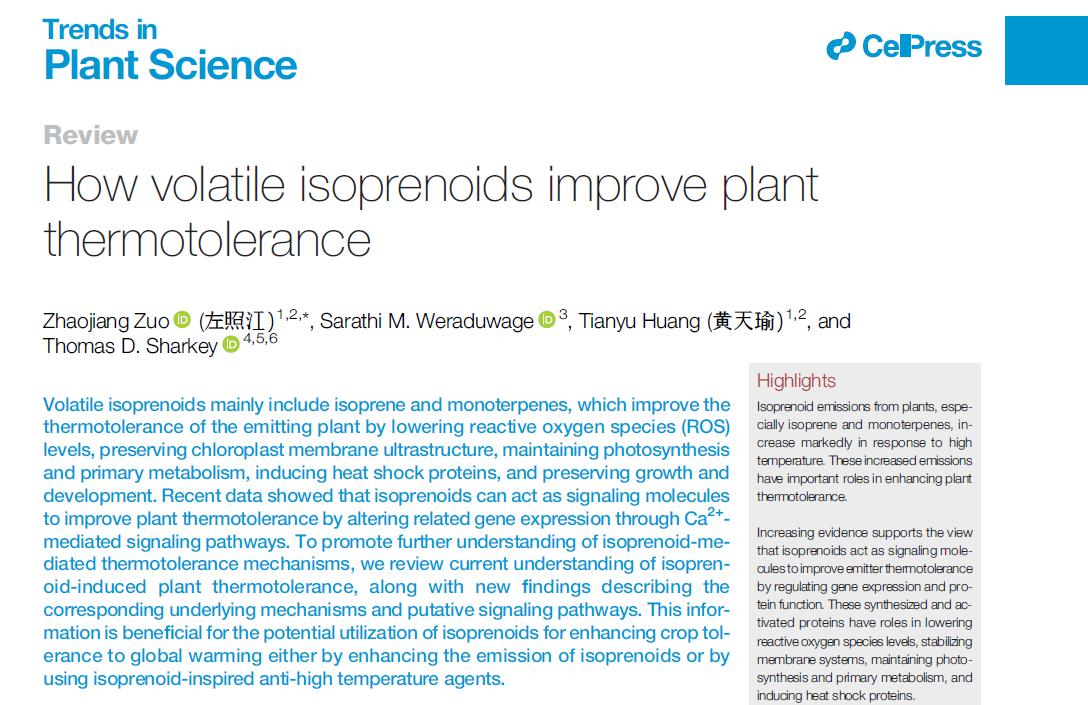 近日,林业与生物技术学院左照江教授课题组在《Cell》旗下植物科学顶级期刊《Trends in Plant Science》(中科院1区Top,IF-5yr=20.1)在线发表了题为“How volatile isoprenoids improve plant thermotolerance”(《类异戊二烯如何提升植物抗高温胁迫能力》)的论文,系统总结了类异戊二烯作为信号分子提升植物抗高温胁迫能力的最新研究进展,为在全球气候变暖背景下提高植物抗高温胁迫能力提供了全新思路。