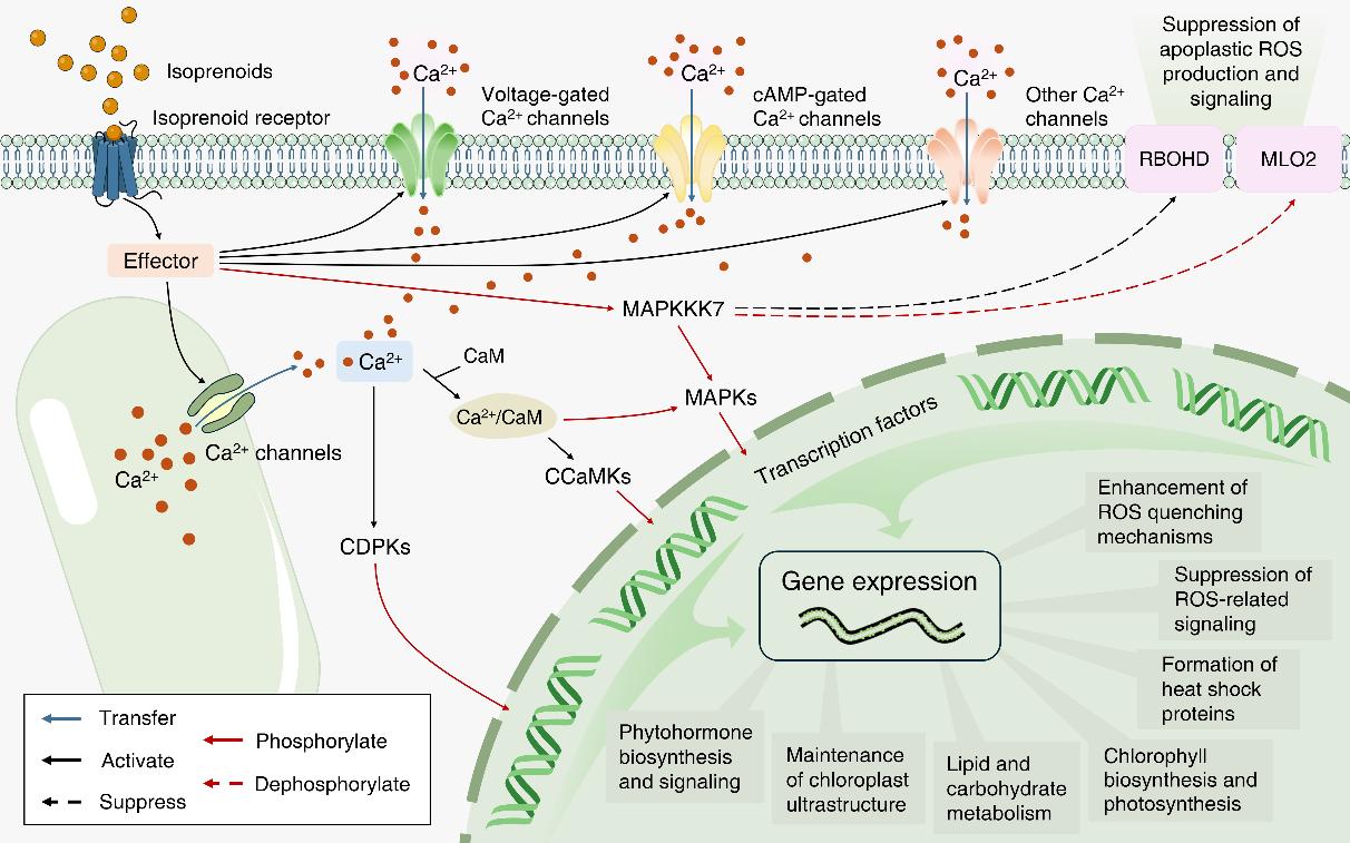 传统假说认为,类异戊二烯可通过嵌入膜间隙以稳定膜结构,直接清除活性氧(ROS)以提高植物抗高温胁迫能力。该论文主要作者前期明确提出,异戊二烯可作为信号分子通过调控基因表达以增强植物抗逆性(Zuo et al.,Plant Physiology,2019)。近年来,越来越多的研究结果支持这一观点。