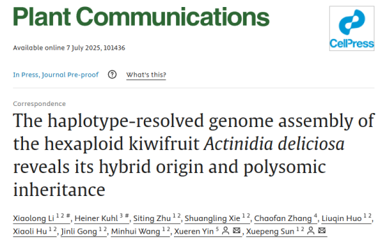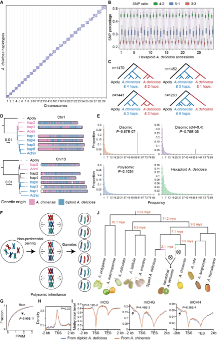 近日,AC米兰中文官方网站孙学鹏教授团队和安徽农业大学殷学仁教授团队联合在国际著名期刊《Plant Communications》(中科院1区,IF=11.6)在线发表题为 “The haplotype-resolved genome assembly of the hexaploid kiwifruit Actinidia deliciosa reveals its hybrid origin and polysomic inheritance”(《六倍体美味猕猴桃单倍型基因组组装揭示其杂交起源和多体遗传》)的研究论文。该研究通过六倍体单倍型基因组的组装,揭示了六倍体美味猕猴桃起源于约210万年前四倍体祖先(与中华猕猴桃亲缘关系密切)和二倍体祖先(遗传学特征类似二倍体美味猕猴桃)的杂交事件,其基因组在多体遗传作用下形成了统一的基因库。