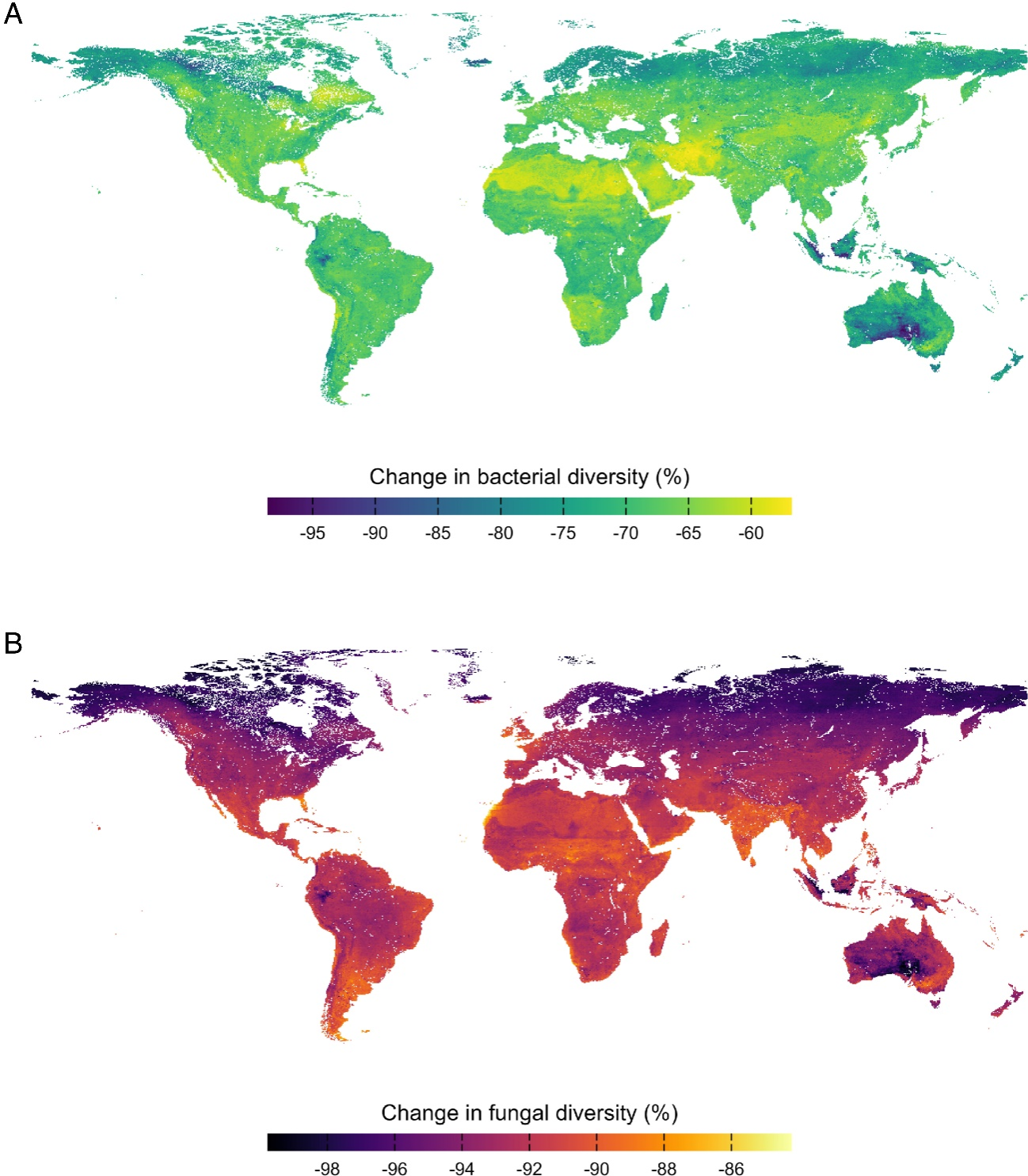 土壤微生物作为森林食品生产等生态功能和服务的基石,其多样性的变化直接关系到土壤健康和生态系统服务的可持续性。该研究整合251组观测数据,在全球尺度上系统揭示气候变暖对土壤微生物多样性的长期影响。结果显示,全球平均升温2.3°C导致细菌和真菌多样性分别下降16.0%和19.7%。环境过滤(如土壤碱化、干旱)及增温导致的氮限制加剧是导致微生物多样性丧失的主要机制。变暖对微生物多样性的负面影响随升温幅度、持续时间及土壤C:N比升高而增强。在最坏气候情景(SSP5-8.5)下,预计未来60年内细菌和真菌多样性可能进一步下降56%和81%,高纬度及高C:N比地区受影响最为严重。