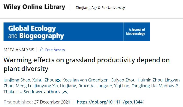 近日,宏观生态学领域顶级期刊Global Ecology and Biogeography(IF=7.148)在线刊发题为“Warming effects on grassland productivity depend on plant diversity”的研究论文。该文阐述了在全球变暖背景下,植物多样性对草地生态系统生产力的非线性调控特征。米兰为该文第一作者单位。
