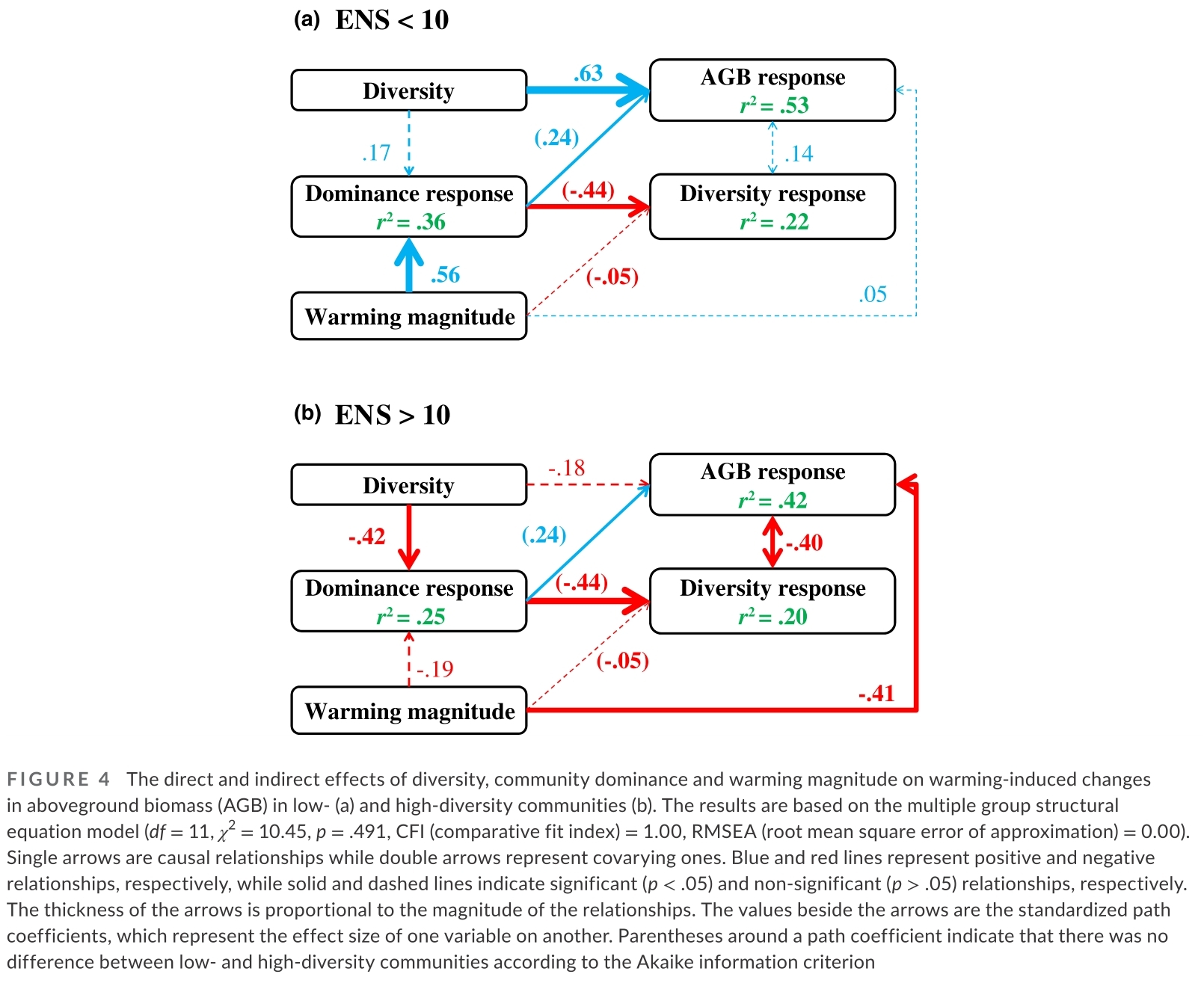 全球气候变化深刻影响着生态系统生产力,并能导致植物多样性的丧失。然而,我们对气候变暖背景下植物多样性如何调控生态系统生产力,仍缺乏机理性的认知。该研究整合了全球草地生态系统增温实验的数据,量化了植物多样性、气候条件和实验设置对草地生产力增温响应的相对重要性,比较了植物多样性高低对生产力增温响应差异的作用机制。