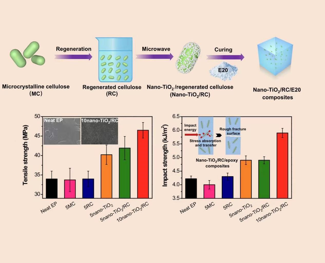 “A nano-TiO2/regenerated cellulose biohybrid enables simultaneously improved strength and toughness of solid epoxy resins”于2021年5月29日发表于复合材料领域国际期刊《Composites Science and Technology》(IF=8.525)上。第一作者为本校博士研究生杨佳瑶,指导老师为AC米兰中文官方网站傅深渊教授、刘晓欢博士和南昆士兰大学宋平安教授。