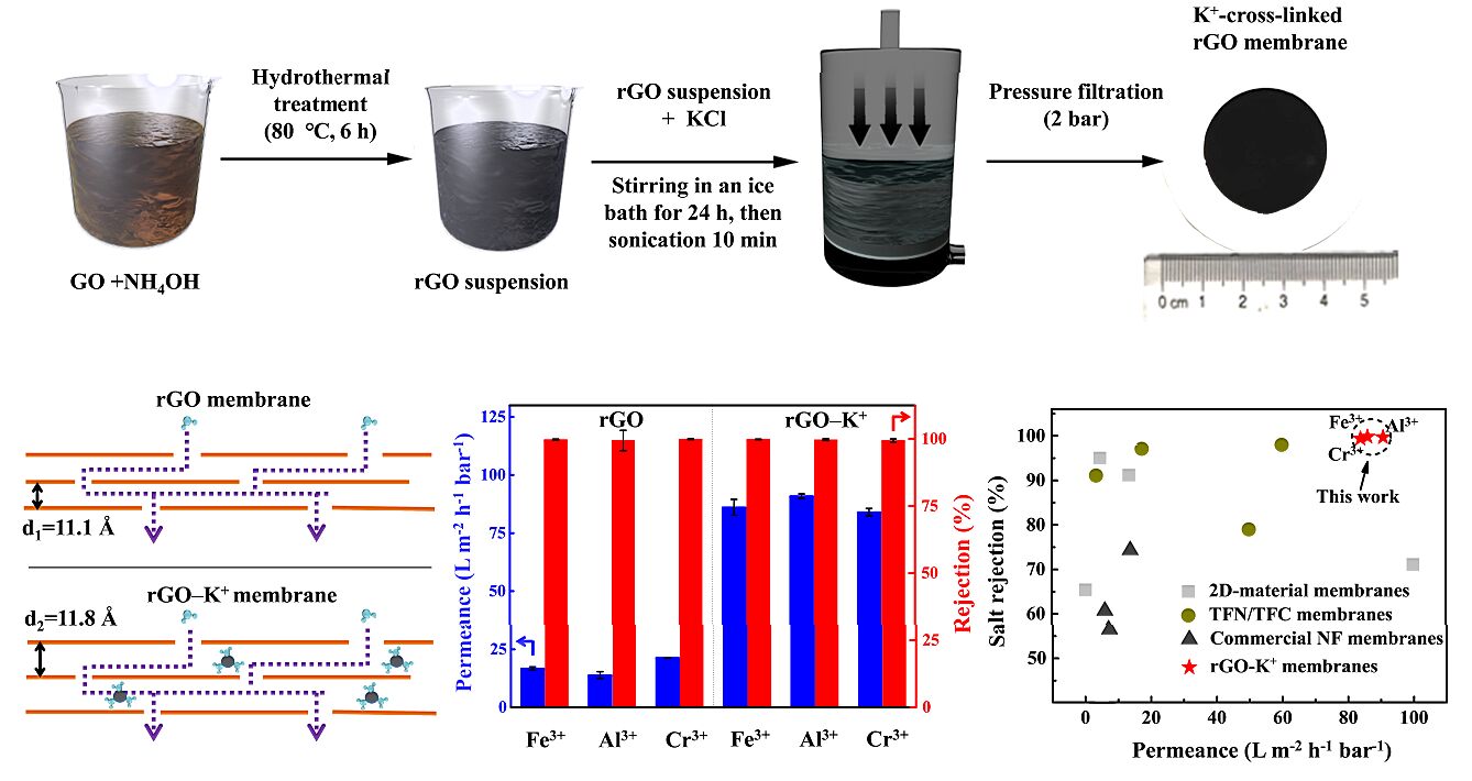 该研究中的rGO-K+纳滤膜制备方法简单,性能优良,在处理污染废水方面具有很大的潜力,可用于开发各种先进的可持续提供清洁水资源的分离膜材料。研究结果为进一步优化设计氧化石墨烯纳滤膜提供了必要的基础,为二维膜材料的应用开发提供了新的思路。