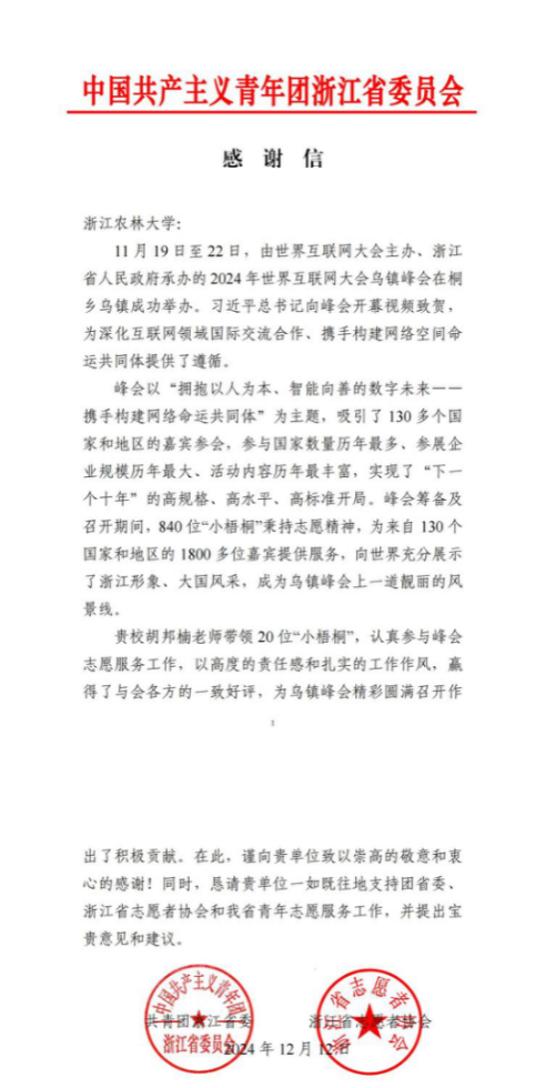 近日,共青团浙江省委、浙江省志愿者协会向米兰发来感谢信,向AC米兰中文官方网站支持2024年世界互联网大会乌镇峰会工作表示衷心感谢。
