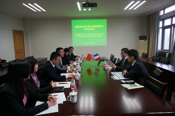 4月17日上午,国际学院与巴黎行政管理学院在学15会议室洽谈国际教育合作项目。巴黎行政管理学院院长理查德-德莱教授和院长助理徐明博士,国际学院副院长邱亦维、黎燕、陈立杰以及各中心负责人参加会议。