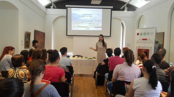 24日,在诺大孔院Karlovci语言高中汉语教学点, “汉语国际推广茶文化传播基地”茶文化培训部钟斐老师做了题为“一带一路与中国茶文化传播”的知识讲座。期间,与现场师生进行了问答互动,场面热闹。讲座后,与两位中国书画家合作,为师生们展示了茶文化艺术和中国书画艺术的魅力,获得了师生们的高度赞誉。